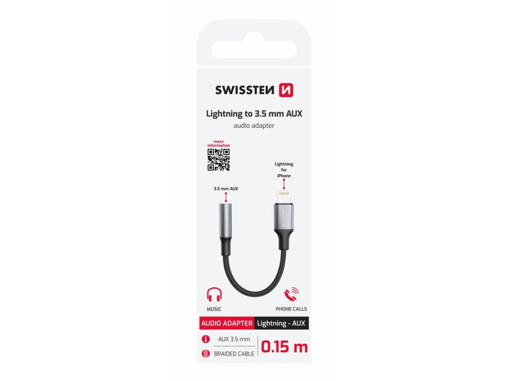 AUDIO ADAPTÉR – LIGHTNING (samec) – SWISSTEN TEXTILE / 3,5mm AUX 0,15 M ČERNÝ