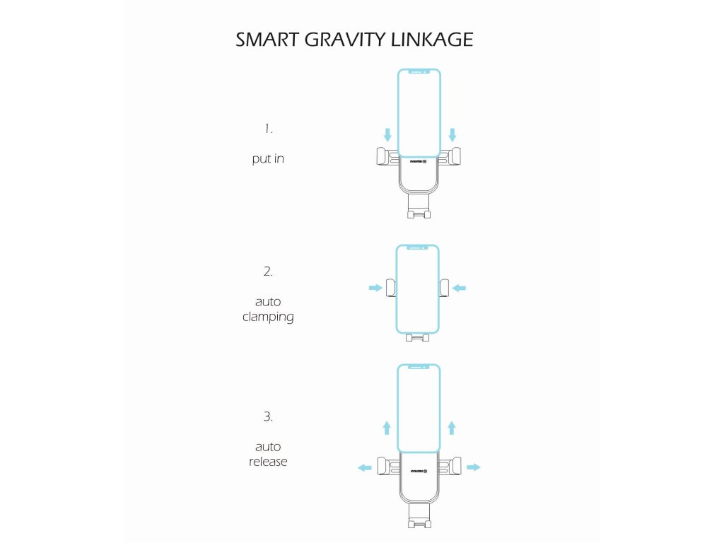 Vložením smartphonu do gravity držáku se váhou smartphonu stáhnou boční čelisti a tím smartphone bezpečně přichytí. Při vyndávání smartphonu se jeho nadlehčením čelisti uvolní. Obrovskou výhodou je, že lze se smartphonem manipulovat jednou rukou.