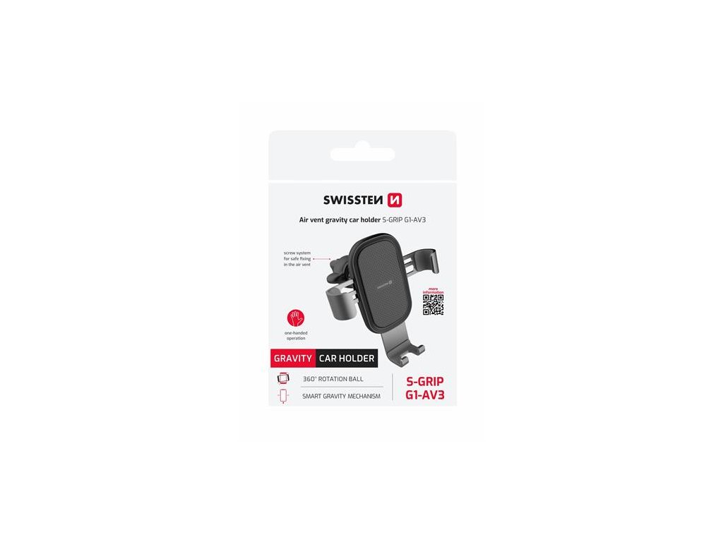 Gravity držák S-GRIP G1-AV3 je určen pro uchycení do větrací mřížky. Sofistikovaný gravity mechanismus pro manipulaci jednou rukou. Baleno v blistru SWISSTEN.